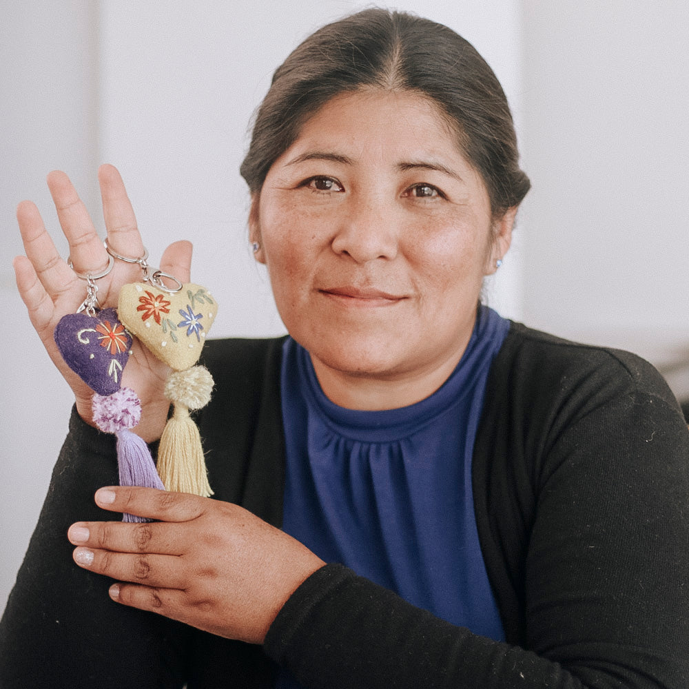 Natural de Puno, mamá de 2 niños que estudian en el Colegio San Juan Apóstol de Villa Cerrillos. Inició su capacitación en el 2017 y hoy está a cargo de su propio taller donde da trabajo a artesanas de Puno. Actualmente fabrica lindos colgadores de bolso en forma de corazón y bordados a mano.